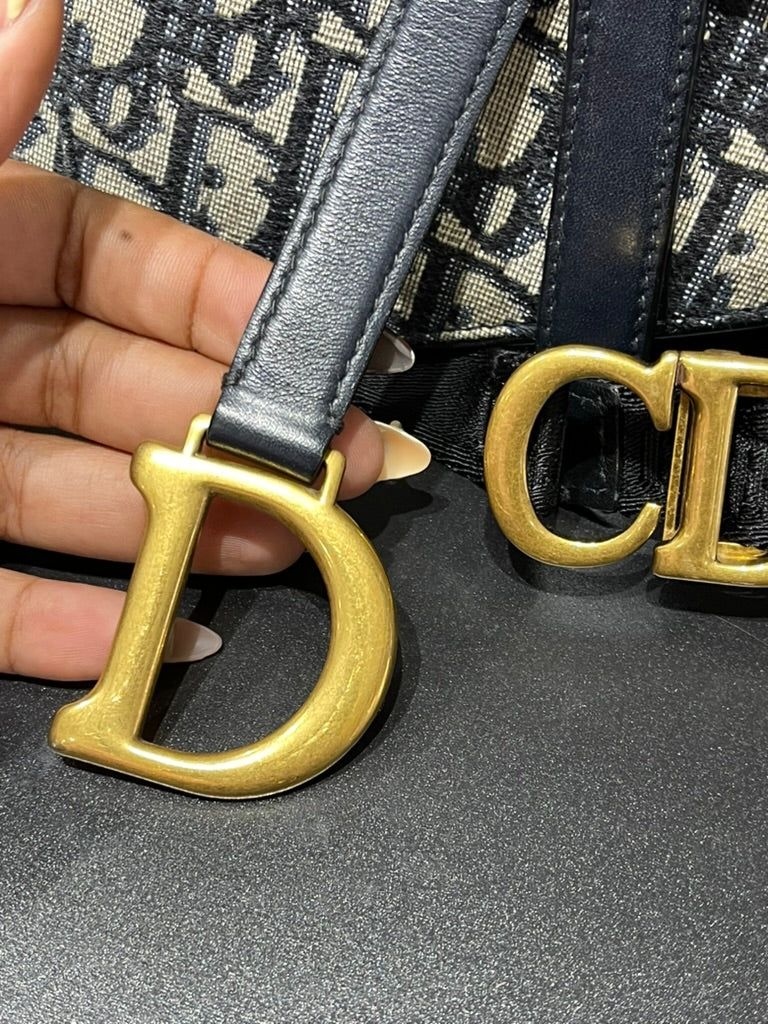 This Christian Dior Oblique Saddle Belt Bag in navy/grey jacquard blends the house’s iconic design with modern versatility. Crafted in signature Dior Oblique canvas with leather trim, the piece features the classic saddle silhouette, an asymmetric flap with snap closure, and the iconic antique gold-finish ‘D’ stirrup charm. The detachable, adjustable strap allows multiple styling options—wear it at the waist, crossbody, over the shoulder, or carry as a clutch.