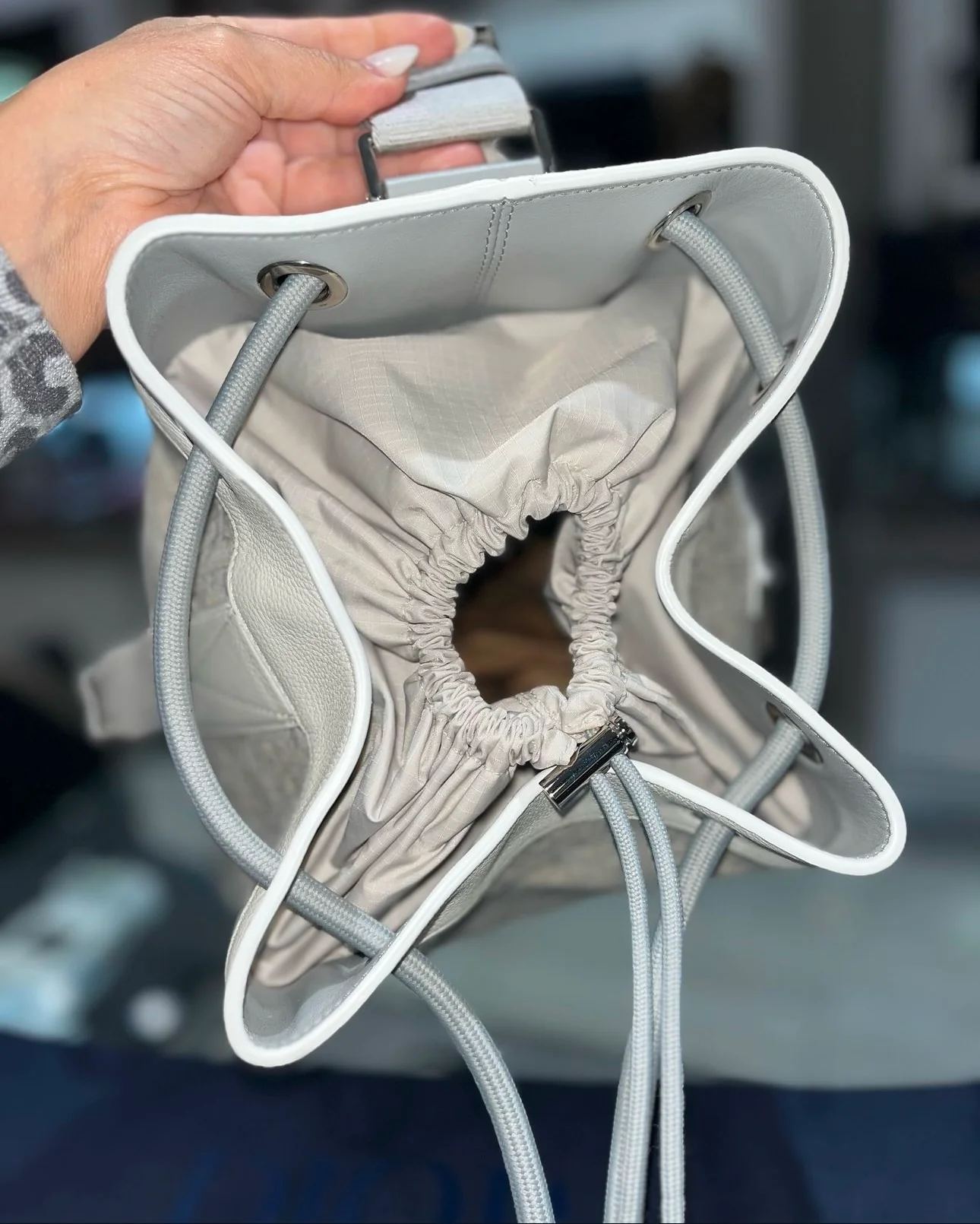 - Design:Signature Dior Oblique pattern with white leather trim.Drawstring top closure for a secure yet casual design.Adjustable nylon strap for versatile carrying options, from shoulder to crossbody.Leather top handle for hand carry.