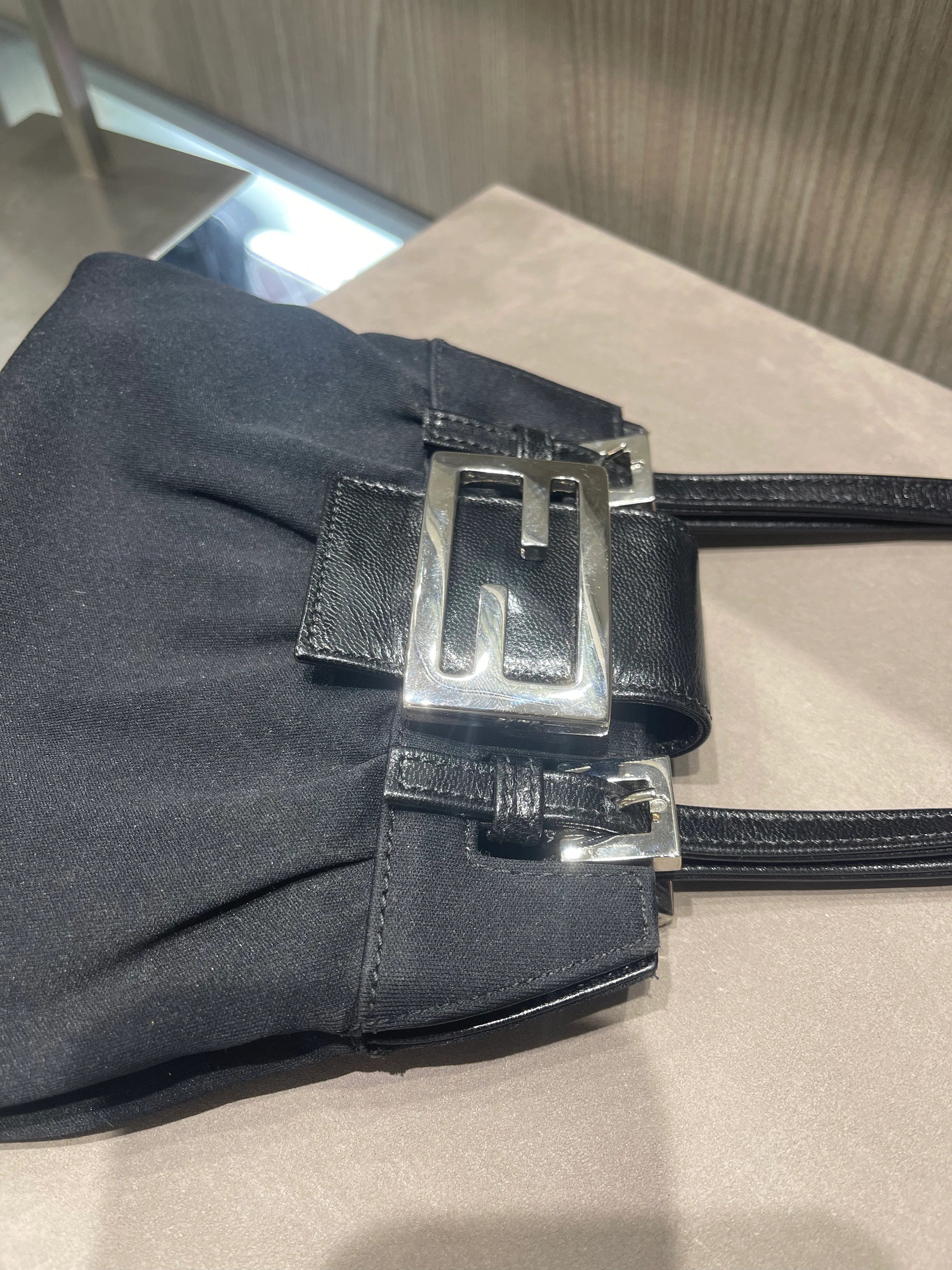This elegant Fendi Mini Handbag combines minimalist sophistication with signature Fendi style. Featuring a black nylon exterior, black leather handles, and a structured frame opening adorned with the iconic silver-tone FF logo buckle, this petite bag is a perfect blend of chic and functional design.
