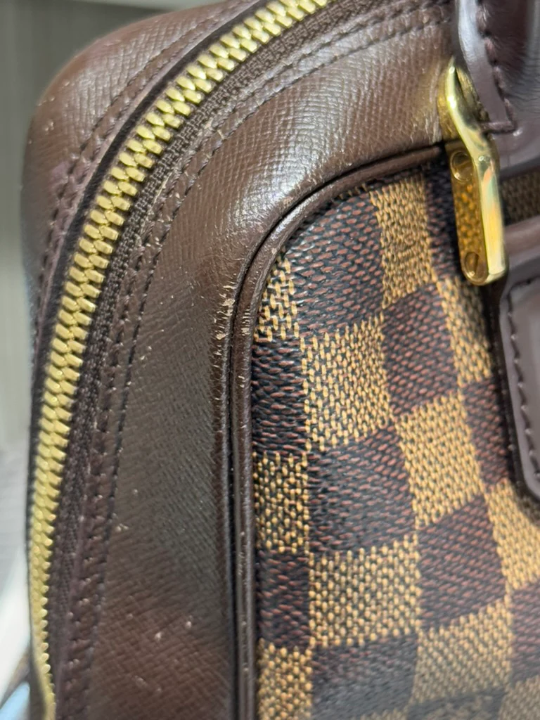 - Material: Signature Damier Ebene canvas with dark brown smooth leather top handles and cross-grain leather zipper trim.