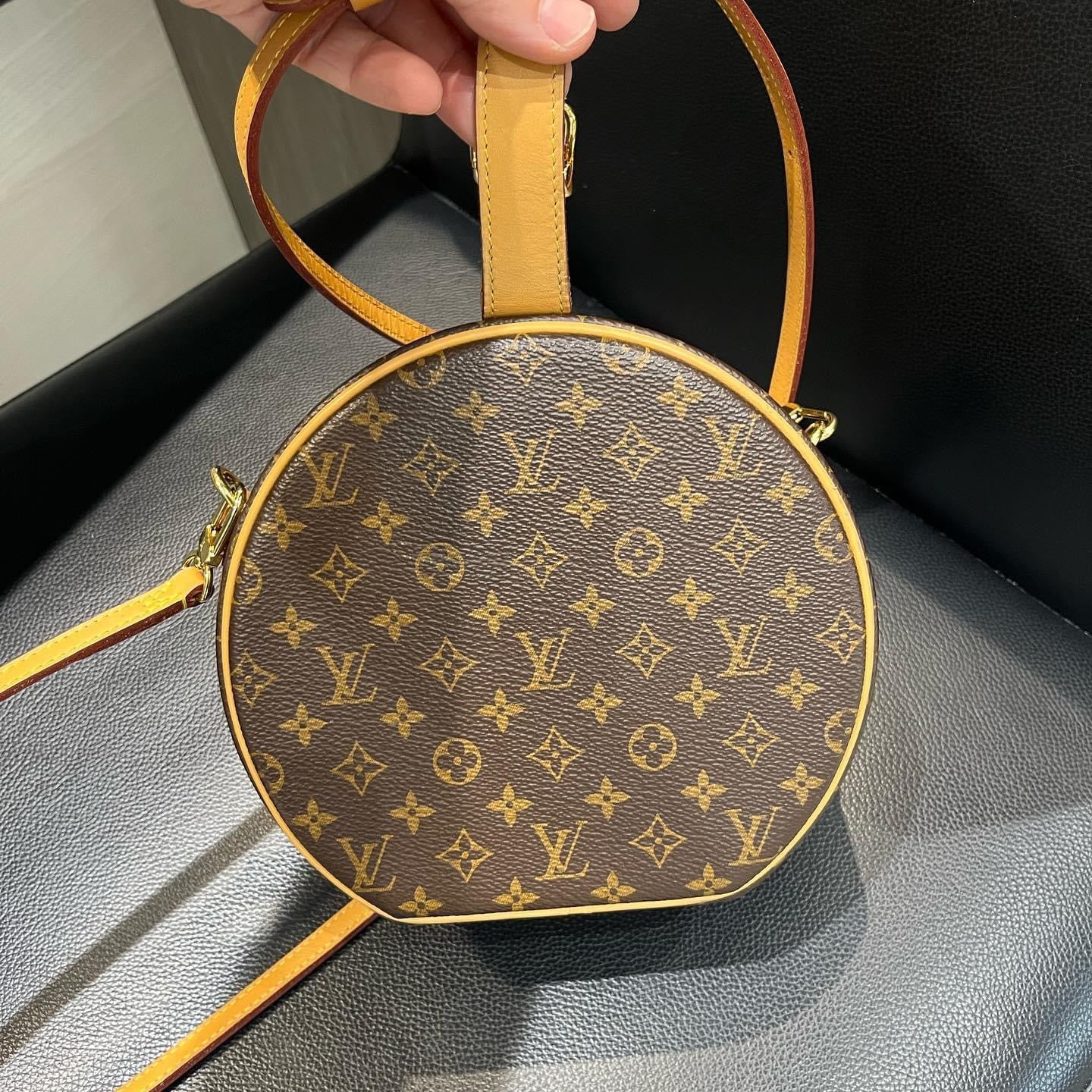 This pre-owned, like-new Louis Vuitton Petite Boite Chapeau is a stylish, versatile addition to any luxury collection. Crafted from iconic Monogram coated canvas and accented with aged natural cowhide leather trim, this bag is both timeless and elegant. The petite 6.9 x 6.5 x 3-inch size makes it a perfect day-to-night companion, offering enough space to carry essentials like a regular-sized iPhone (though an iPhone Pro Max may not fit), lip gloss, and a small wallet. Lined with smooth lambskin and featuring gold-tone metallic hardware, it also has four protective brass studs to keep it pristine when placed down.