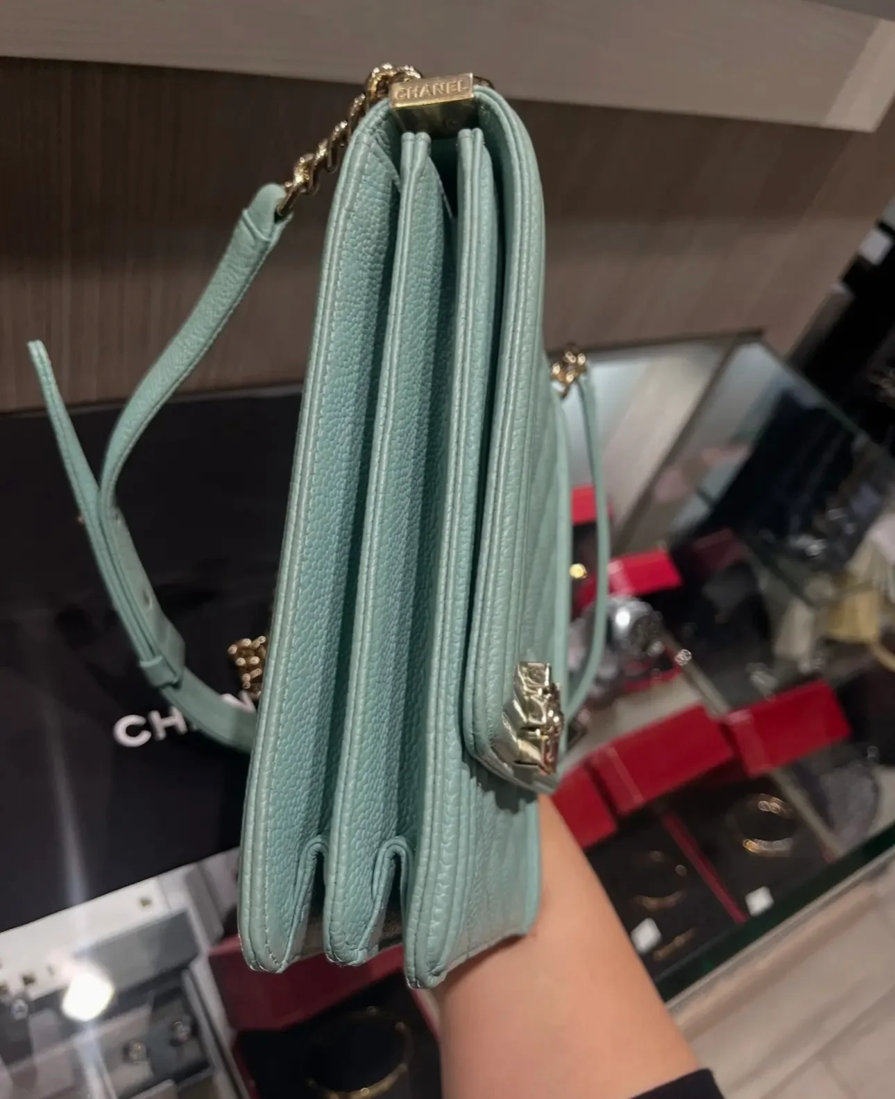 - Hardware: Gold-tone hardware, including the iconic CC Boy push-lock closure.