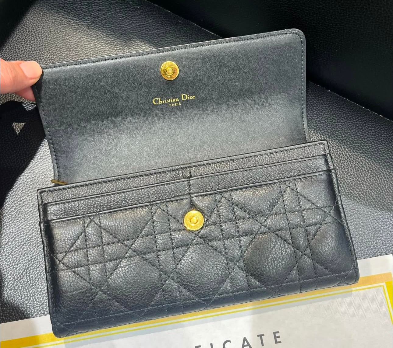 Elevate your accessory game with this Dior Caro Orchid Long Wallet, a perfect blend of sophistication and functionality. Crafted in black calfskin, it features the iconic Cannage topstitching that exudes timeless elegance. The CD signature flap on the front adds a refined touch, making it a statement piece for any Dior enthusiast.